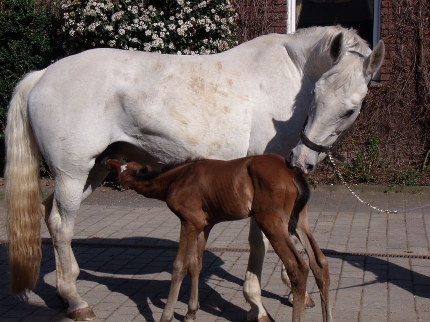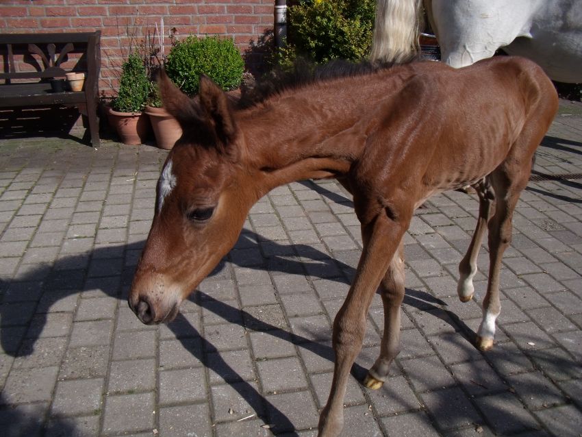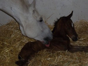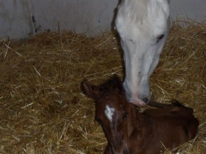 Vor fast einer Woche, in der Nacht von Sonntag auf Montag, hat Wyona ihr Fohlen geboren – einen kleinen braunen Hengst mit Stern und zwei weißen Füßen. Wahrscheinlich wird er nicht wie seine Mama Schimmel werden, sondern dunkel bleiben. Der kleine Mann wurde auf den Namen Ribéry getauft.