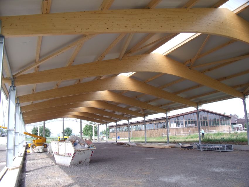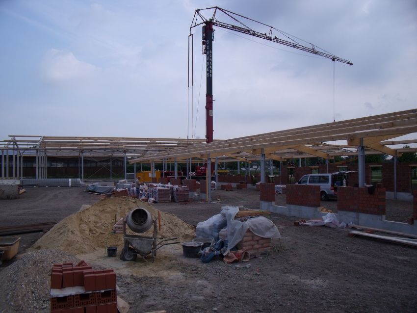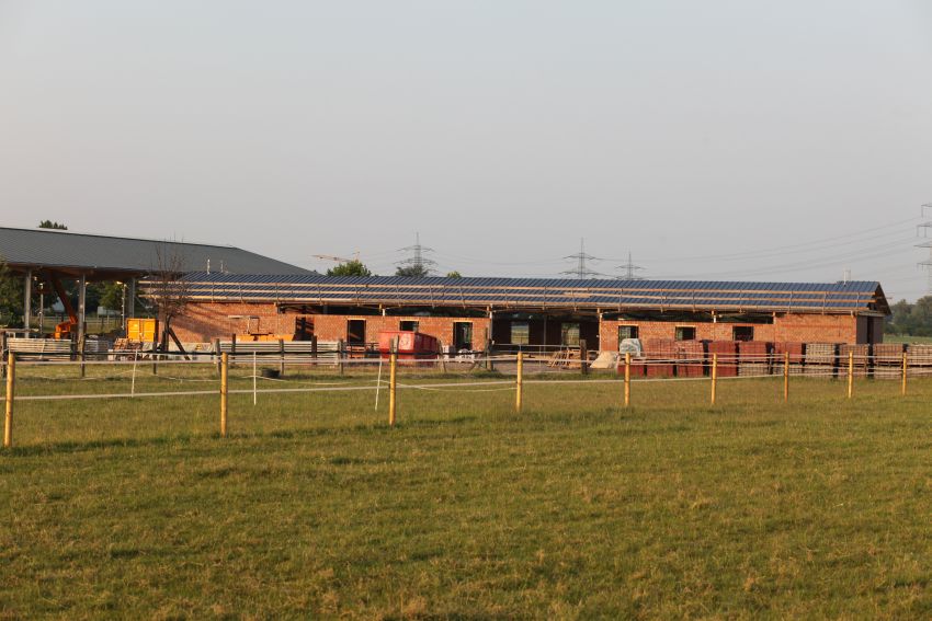 Auf unserer Baustelle geht es mit großen Schritten voran, auch dank des guten Wetters in den vergangenen Tagen und Wochen. Inzwischen wurden die Stützen für die neue Reithalle aufgebaut und die Halle hat bereits ein Dach bekommen. Der erste Stall hat nun ebenfalls ein Dach, außerdem wurden hier die Außenwände gemauert.